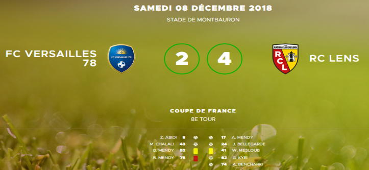 Versaillais et Lensois nous ont régalés lors de ce 8e tour de Coupe de France avec pas moins de 6 buts inscrits ! C’est face à une équipe de National 3 combattive que les Lensois rencontraient des difficultés en début de rencontre, à l’image du but concédé rapidement (1-0). Mais les Sang et Or reprenaient rapidement le contrôle du match et l’avantage (1-2), avant de se faire rejoindre deux minutes avant la pause (2-2). De retour des vestiaires, les hommes de Philippe Montanier reprenaient confiance grâce à une réalisation de Kyei (2-3) avant de sceller le sort de Versailles (2-4, 74e) réduit à 10 pour les 15 dernières minutes de jeu